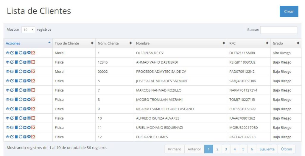 En el listado principal muestra los clientes previamente dados de alta, en el cual es posible Crear, Consultar, Editar, Documentar, Reclasificar, Complementar, generar una Alerta y/o Eliminar cada uno de los registros.