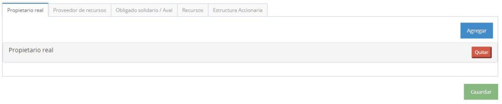 Permite agregar complementos al cliente en cualquiera de sus tres categorías (Propietario real, Proveedor de recursos, Obligado Solidario).