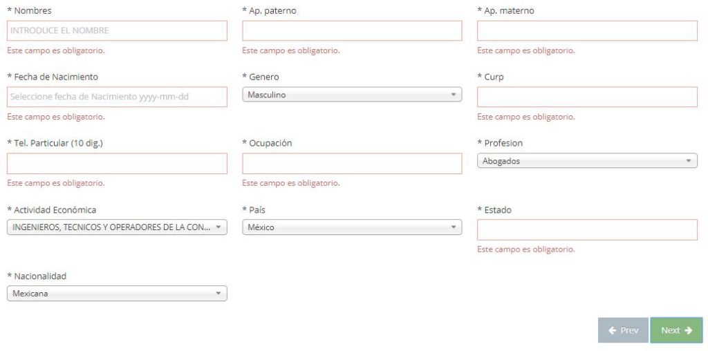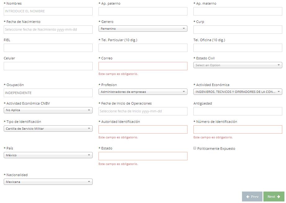 Para registrar un nuevo cliente es necesario presionar el botón CREAR, el cual solicita los datos que se muestran a continuación según el tipo de cliente seleccionado.