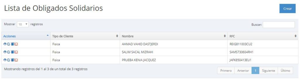 En el listado principal muestra los obligados solidarios previamente dados de alta, en el cual permite Crear, Consultar, Editar o Eliminar cada uno de los registros.