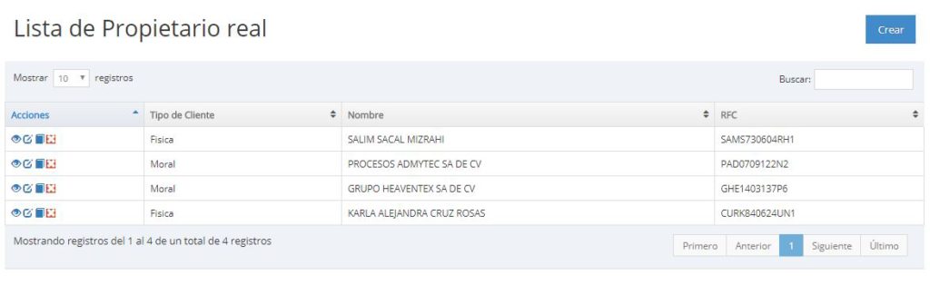 En este módulo permite gestionar los propietarios reales que se utilizaran en el sistema. En el listado principal muestra los propietarios reales previamente dados de alta, en el cual permite Crear, Consultar, Editar o Eliminar cada uno de los registros.