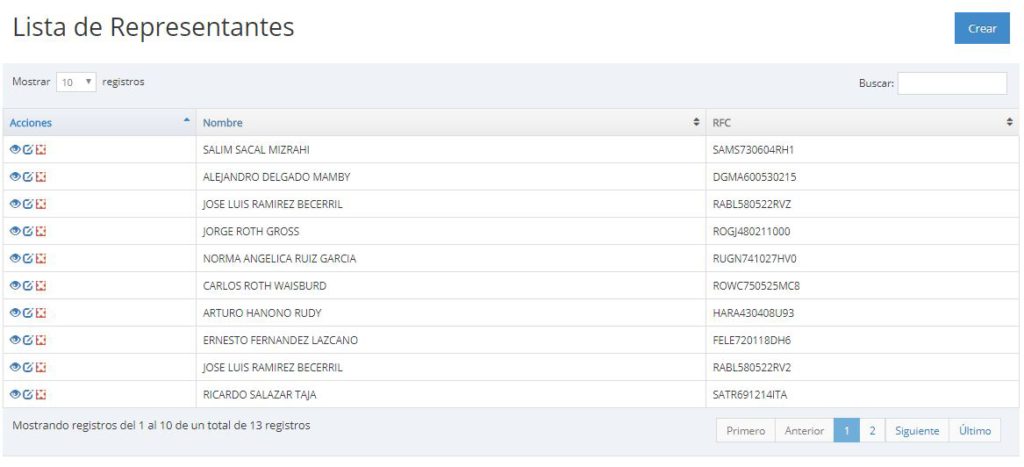En el listado principal muestra los Representantes previamente dados de alta, en el cual permite Crear, Consultar, Editar o Eliminar cada uno de los registros.